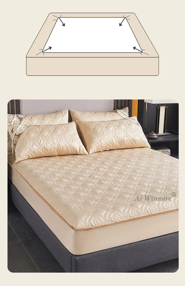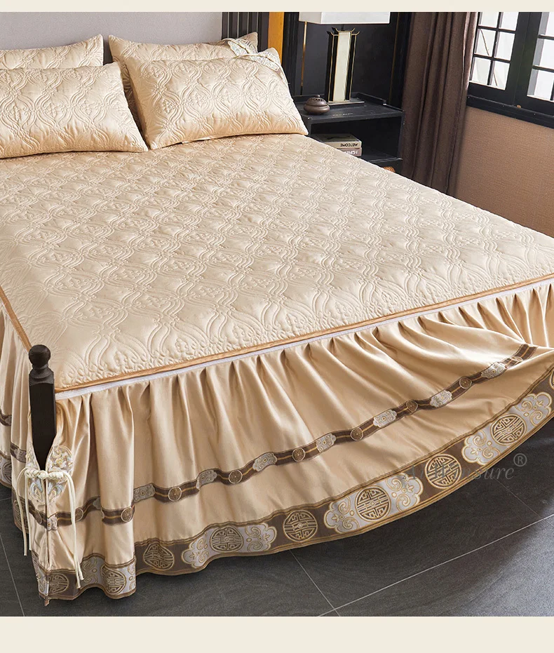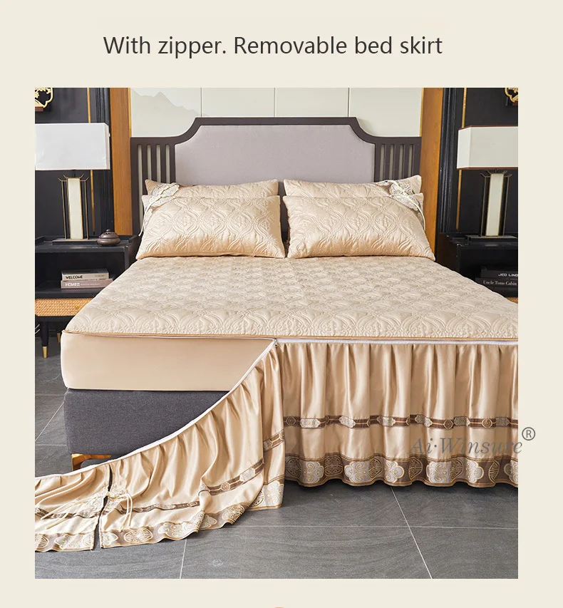 Optez pour le luxe avec le Couvre-lit En Satin Beige Champagne Jupe De Lit À Volants Brodée Avec Fermeture Éclair 3 Pièces