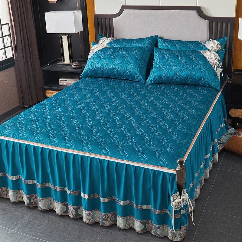 Couvre-lit En Satin Bleu Roi Jupe De Lit À Volants Brodée Avec Fermeture Éclair 3 Pièces pour une chambre luxueuse